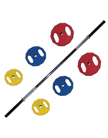 Комплект включает в себя хромированный гриф и 3 пары обрезиненных дисков весом 1,15 кг (синие), 2,3 кг (желтые), 4,5 кг (красные).