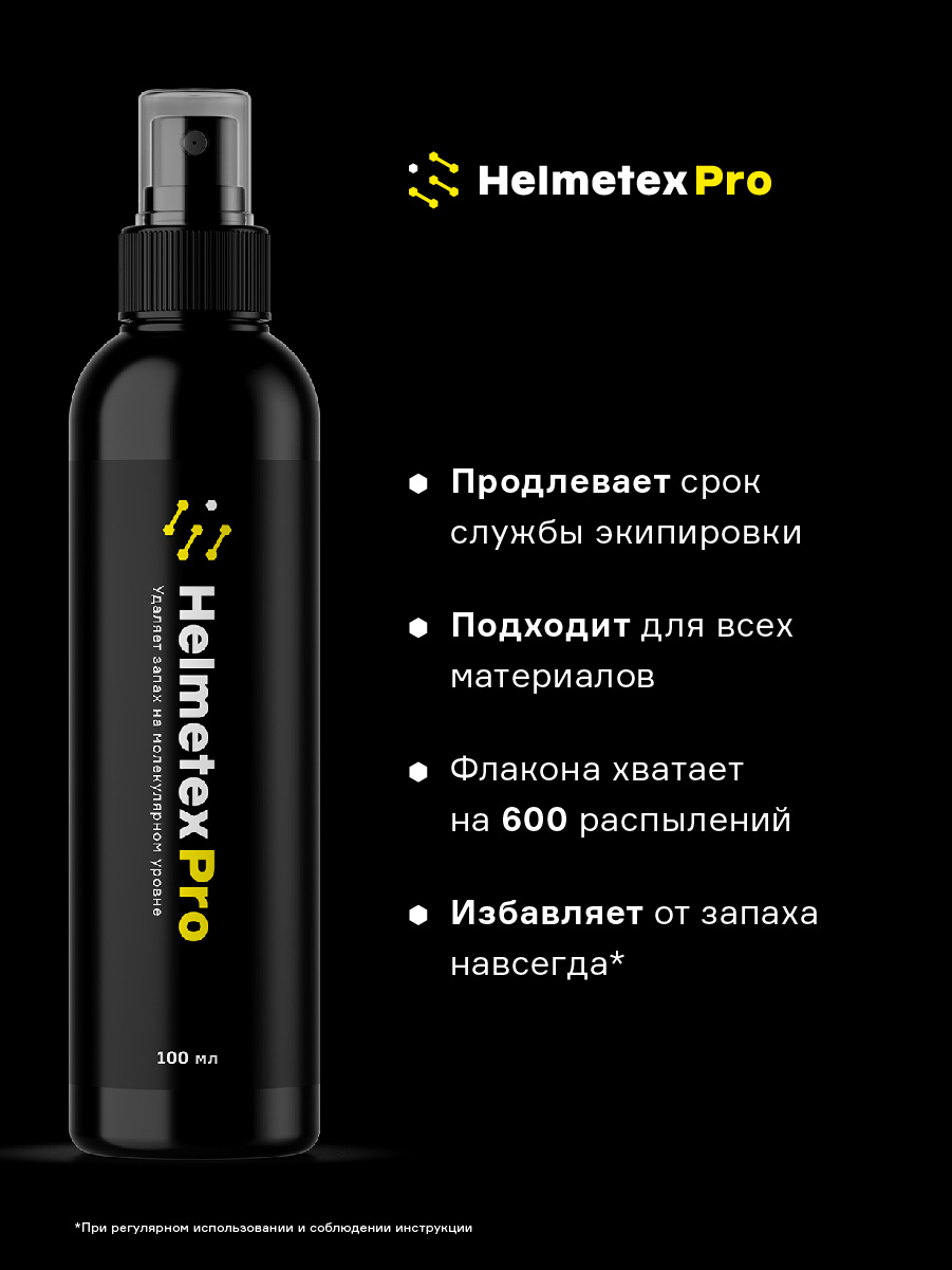 Helmetex Pro предназначен для гигиенической обработки и устранения запаха в шлемах, касках, балаклавах, бейсболках и других головных уборах. Спрей удобен и практичен для использования в условиях, когда стирка и химчистка подкладки шлема затруднена или невозможна, в том числе в походе и на сборах. Спрей продлевает срок службы подшлемника за счет уменьшения количества стирок. Helmetex препятствует развитию бактериальной флоры и тем самым уменьшает риск покраснения кожи и зуда головы.