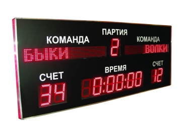 Универсальное спортивное табло для улицы. Отображает игровое время, счет, номер партии, названия команд.