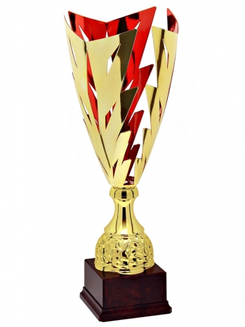 Кубок "золотого"/красного цвета, чаша металлическая. Основание (ножка) кубка изготовлено из качественного пластика под "золото" с рельефным узором. Кубок установлен на красном пластиковом постаменте (цоколе). Постамент кубка можно укомплектовать табличкой с надписью из металла или ПВХ-пленки.