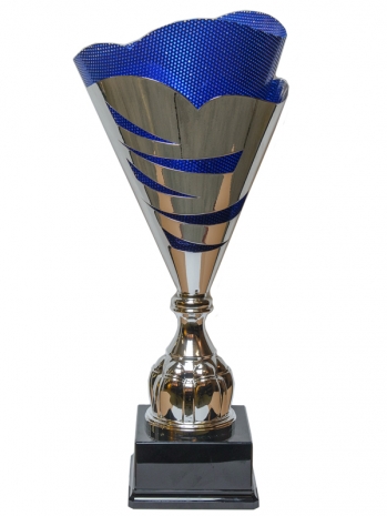 Кубок "серебряного"/синего цвета, чаша металлическая. Основание (ножка) кубка изготовлено из качественного пластика под "серебро" с рельефным узором. Кубок установлен на черном пластиковом постаменте (цоколе). Постамент кубка можно укомплектовать табличкой с надписью из металла или ПВХ-пленки.