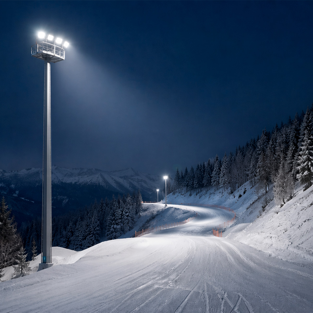 Обеспечивают равномерное освещение трасс, сноупарков, стадионов и трибун при ночных спусках и соревнованиях. Высота мачт — до 120 м для работы в сложных горных условиях.