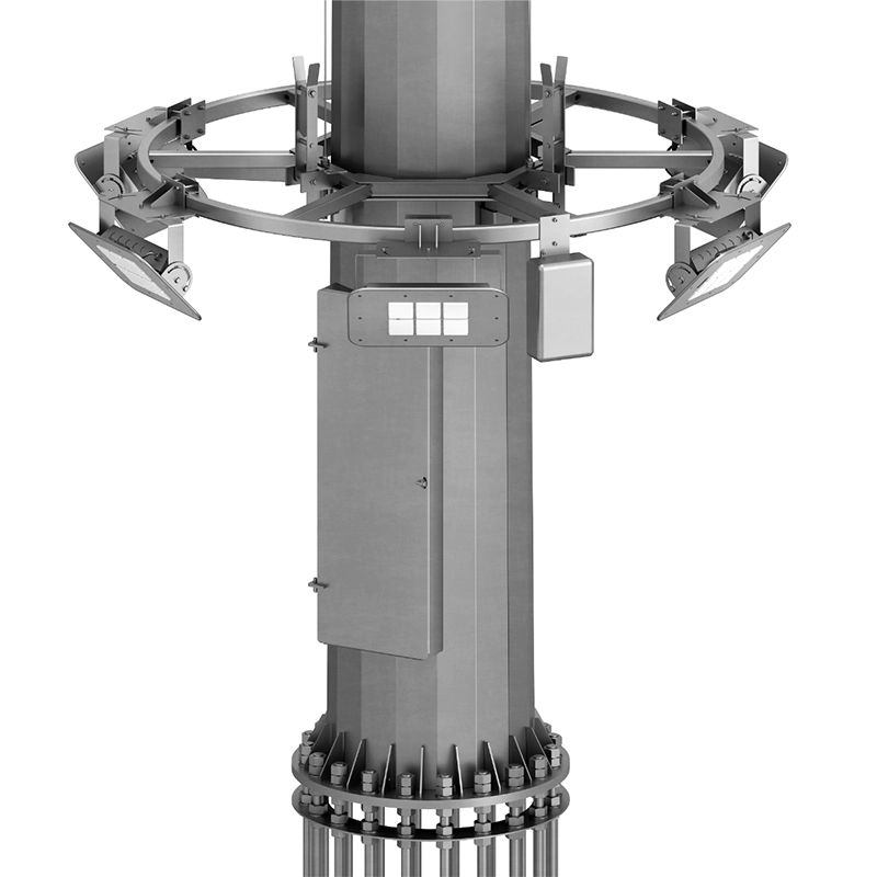 Мачты с мобильной короной до 12 прожекторов. Она опускается на землю для обслуживания без подъёмной техники.