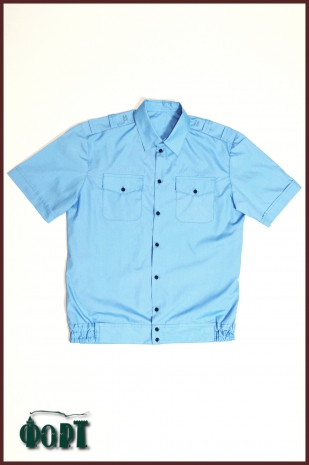 Рубашка выполнена из сорочечной ткани голубого цвета. Модель укороченная на поясе с резинкой. Застежка на пуговицах. Погоны, клапаны нагрудных карманов и отделка воротника выполнены из сорочечной ткани черного цвета. Воротник отложной. Так же имеется вариант с длинным рукавом.