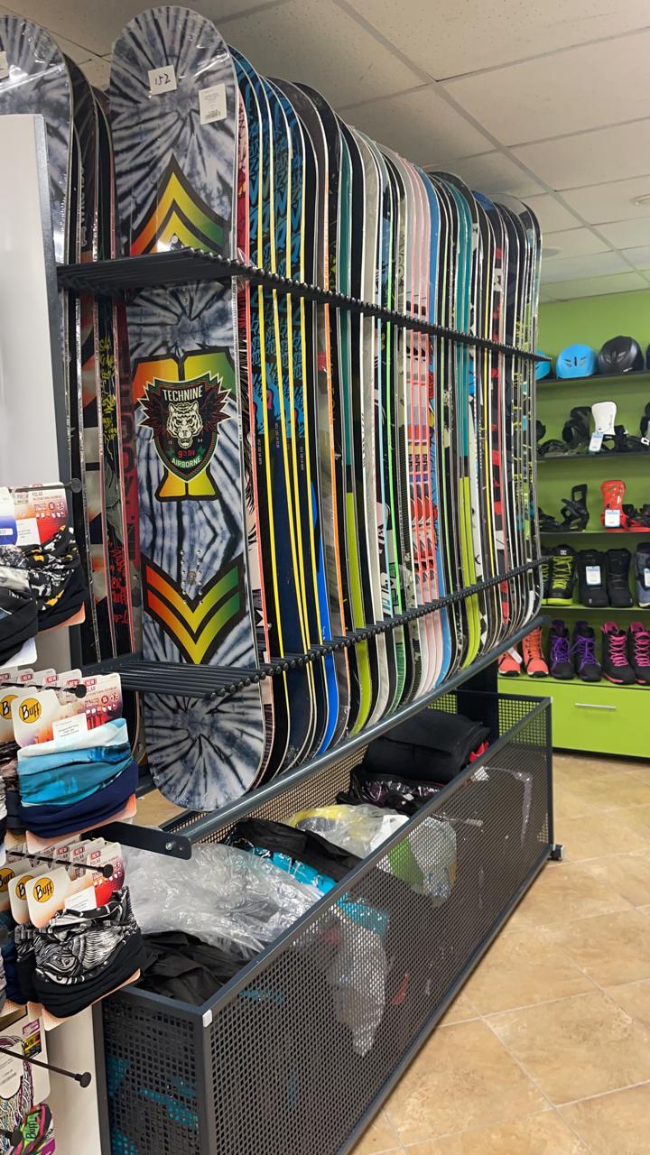 - Разделители регулируются по высоте с шагом в 5 см, что позволяет настроить стеллаж под любую длину сноубордов. Благодаря отдельному хранению досок от креплений система имеет большую вместимость.
