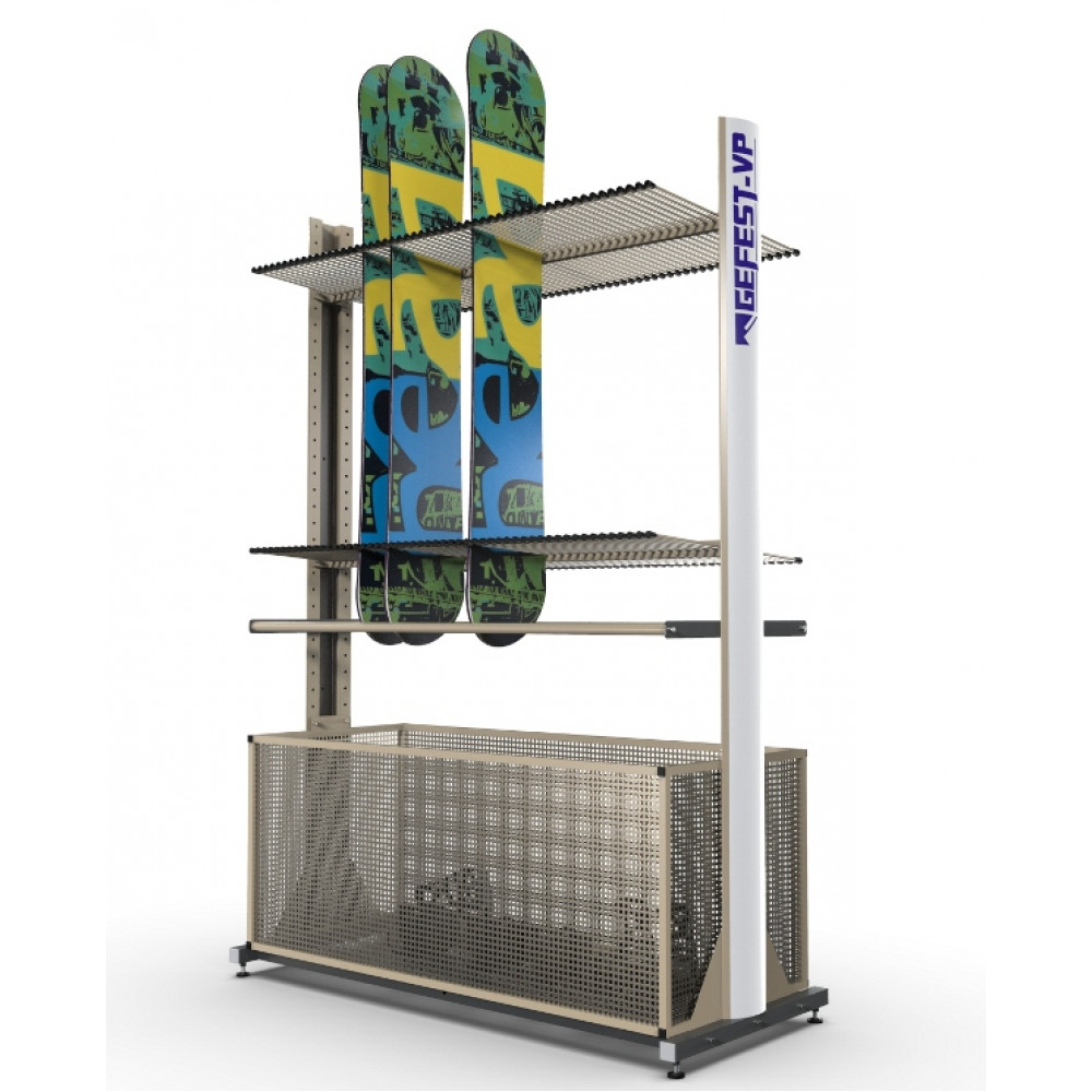 Стеллажи СП-2 предназначены для хранения сноубордов различной длины и размеров. Конструктив данной системы предусматривает двухстороннее размещение сноубордов с отдельным хранением креплений. В нижней части стеллажа расположена корзина для хранения креплений, она выполнена из перфорированного листового металла, над корзиной расположены стальные держатели из круглой трубы, на которые вертикально опираются сноуборды.