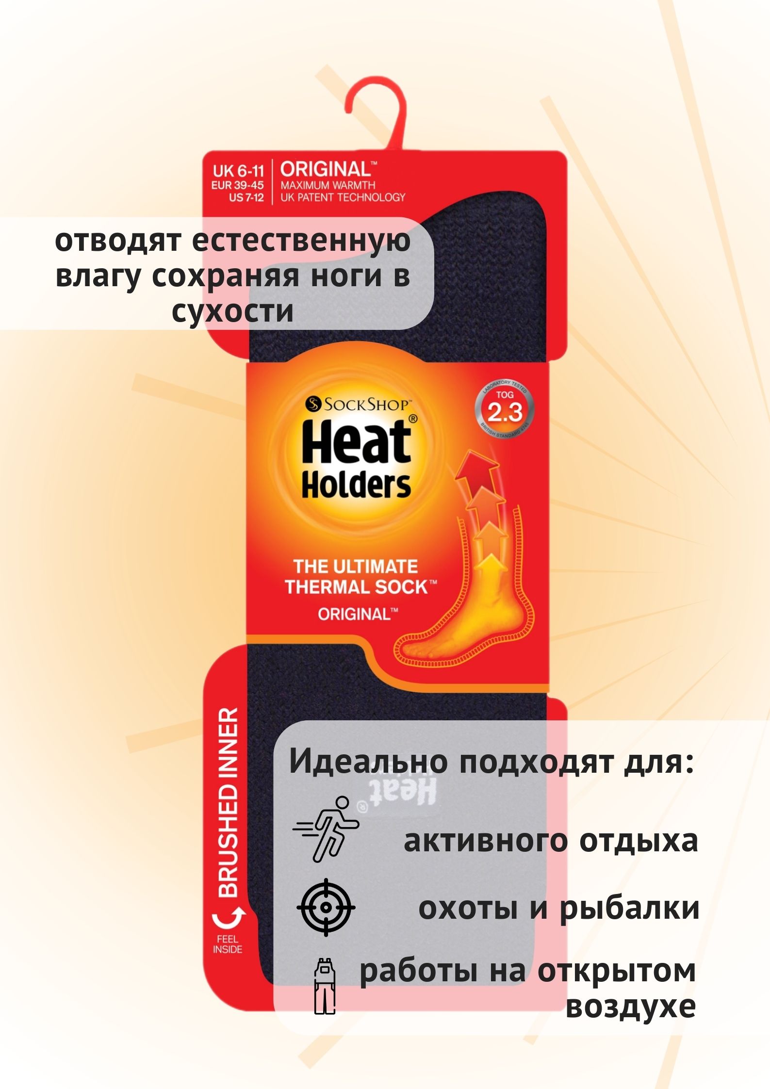 Мужские носки Heat Holders Original! В модели The Original используется теплоизоляционная пряжа высшего качества. Мягкий начес с изнаночной стороны увеличивает воздушную прослойку между носком и ногой, обеспечивая тепло в холодные дни. Термо-пряжа отводит излишнюю влагу, сохраняя сухость и комфорт. Идеально подходят для дома, охоты, рыбалки, для ношения со специальной обувью и суровых условий работы.