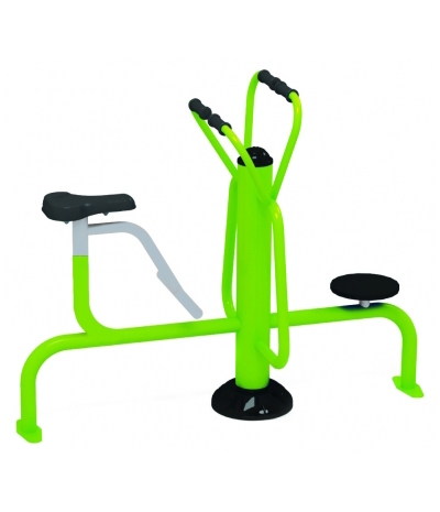 с одной стороны тренажера пользователь становится на вращающийся диск и, держась за рукоятки, совершает четверть-обороты в разные стороны. С другой стороны тренажера, держась за рукоятки, второй пользователь совершает четверть-обороты в положении сидя.