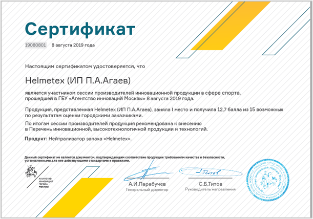 Helmetex получил 1 место Агентства Инноваций г.Москвы в 2019 г. за лучший инновационный продукт в сфере спорта.