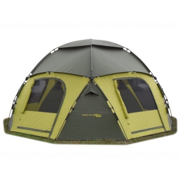 Причем его можно использовать как на кратковременных выездах (1-2 дня), так и при длительных походах. Конфигурация пола шатра представляет собой десятиугольник. Шатер имеет пять больших входов-дверей. Каждая из них закрывается противомоскитной сеткой и сверху сетки дублируется дождезащитной стенкой.