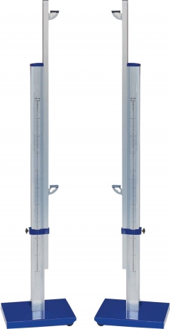 В комплект входят 2 стойки. Основа представляет собой стальную платформу. Колесики с боковой стороны, для удобства передвижения. Вертикальная стойка телескопическая: неподвижный алюминиевый профиль 78х50 мм и выдвижной алюминиевый профиль 30х30 мм. 2 стальные полочки для установки планки. Регулируемая высота 600 – 2600 мм. Вес комплекта 16 кг.