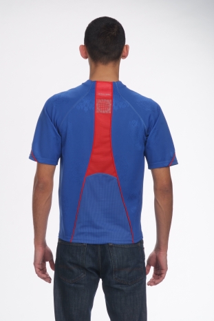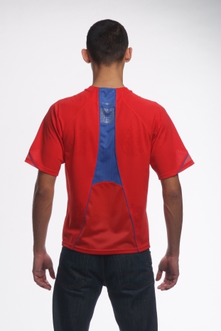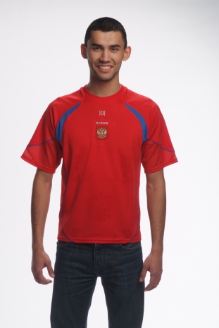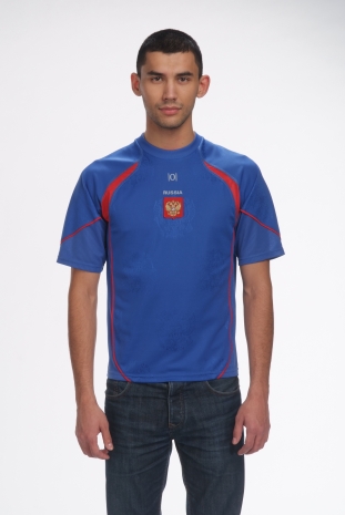 Эффектная футболка комбинированного кроя с контрастными вставками и кантами. Футболка изготовлена из текстурированной ткани (жаккарда) с узором герба России. Легкий материал с мягким мерцанием произведен на одной из ведущих фабрик в Италии. Футболка дышит, подобно второй коже, прекрасно впитывает влагу и предотвращает перегрев во время занятий спортом или при повседневной носке. Вставки из сетчатой ткани на спине, по бокам и на рукавах дополнительно регулируют температуру тела.