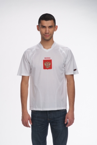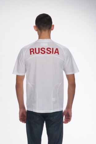 Футболка декорирована нашивкой с гербом России на груди и объемной надписью RUSSIA контрастного цвета на спине. Полуприлегающий силуэт обеспечивает максимальный комфорт и подчеркивает фигуру.