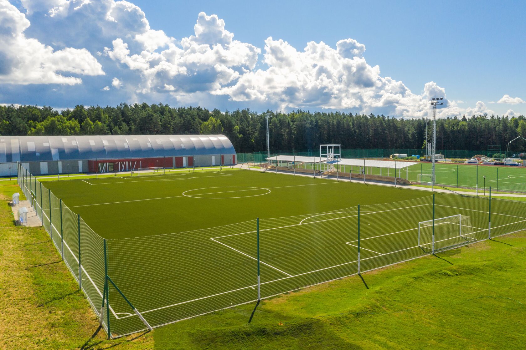 Сетка ограждения белого цвета по периметру поля высотой 6 метров.