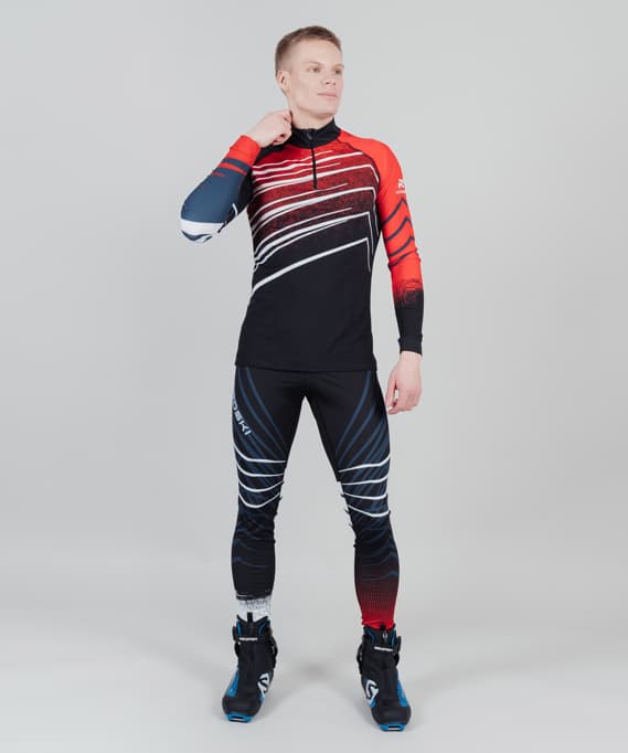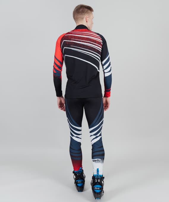 Костюм состоит из рубашки и лосин. Выполнен из эластичного, легкого материала, который обеспечивает минимальный вес. Материал тянется в 4 стороны и не стесняет движения. Плоские швы создают ощущение бесшовной одежды. Растягиваются наравне с тканью, позволяют избежать натирания во время интенсивных тренировок. Резинка с силиконовым покрытием по низу гоночной рубашки фиксирует модель на фигуре.  Лосины имеют резинку  на поясе и утягивающий шнурок. Дизайн выполнен методом сублимационной печати.