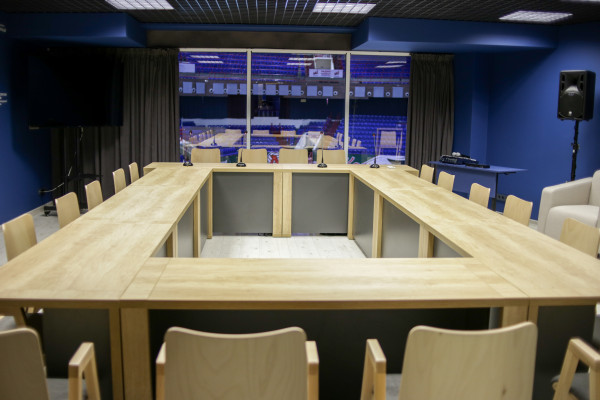- Одна из стен зала представляет собой панорамные окна с видом на главную арену (можно закрыть шторами)