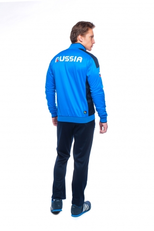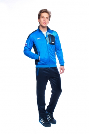 Куртка из трикотажного полотна с центральной застежкой на тесьму - "молнию" с контрастными вставками и воротником-стойкой.На груди расположен бесшовный карман с тесьмой "молнией". Рукава втачные. Боковые карманы обработаны тесьмой - "молнией". Воротник, манжеты, пояс из трикотажного полотна. Брюки с боковыми карманами обработанными тесьмой - "молнией", пояс с эластичной тесьмой, регулируемый шнуром. Состав: трикотаж 100%полиэстер, 210г/м2. Нанесения:вспененный принт логотипа, жаккардовый шеврон "герб ", вспененный принт "RUS", вспененный принт "RUSSIA", жаккардовый лейбл "глобус", жаккардовый шеврон "флаг", жаккардовый лейбл "FORWARD".