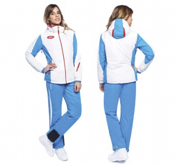 Костюм утепленный (горнолыжный) состоит из куртки и брюк. Куртка утепленная с застежкой на молнию. По бокам утепленные карманы - два боковых с водонепроницаемыми застежками молниями. Утепленный капюшон отстегивается при помощи застежки-молния, по краю капюшона регулировка с помощью эластичного шнура и стопперов. Рукава втачные, ширина рукава регулируется с помощью пат, в левом рукаве - карман для ски-паса. Под проймами застежка-молния с сеткой для вентиляции. Модель оснащена снегозащитной юбкой, внутренними карманами для мобильного телефона и мелочей. Брюки утепленные на поясе с отстегивающейся спинкой. По бокам регулировка ширины пояса. Колени профильные. В нижней части брюк выполнены манжеты, защищающие от попадания снега.