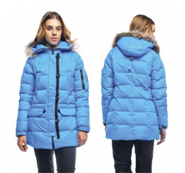 Куртка пуховая с капюшоном, с отстегивающимся натуральным мехом. Центральная застежка на молнию и пуговицы с воздушными петлями. По бокам два кармана с клапанами на кнопках. На груди расположены прорезные карманы с застежкой на кнопку. На рукаве выполнен дополнительный накладной карман на молнии. Регулируемые манжеты на липучках. Утяжка кулисой на талии.