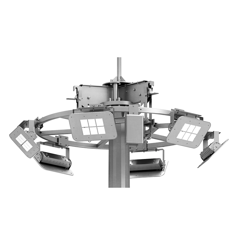 Мачты с мобильной короной до 12 прожекторов. Она опускается на землю для обслуживания без подъёмной техники.