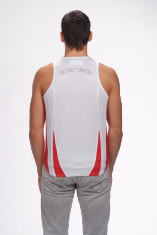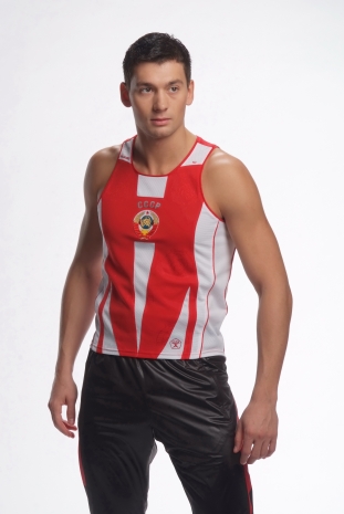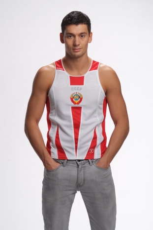 Стильная майка необычного кроя с контрастными вставками из текстурированной ткани (жаккарда) с узором герба СССР. Легкий материал с мягким мерцанием произведен на одной из ведущих фабрик в Италии. Майка дышит, подобно второй коже, прекрасно впитывает влагу и предотвращает перегрев во время интенсивных физических нагрузок. Вставки из сетчатой ткани дополнительно регулируют температуру тела.