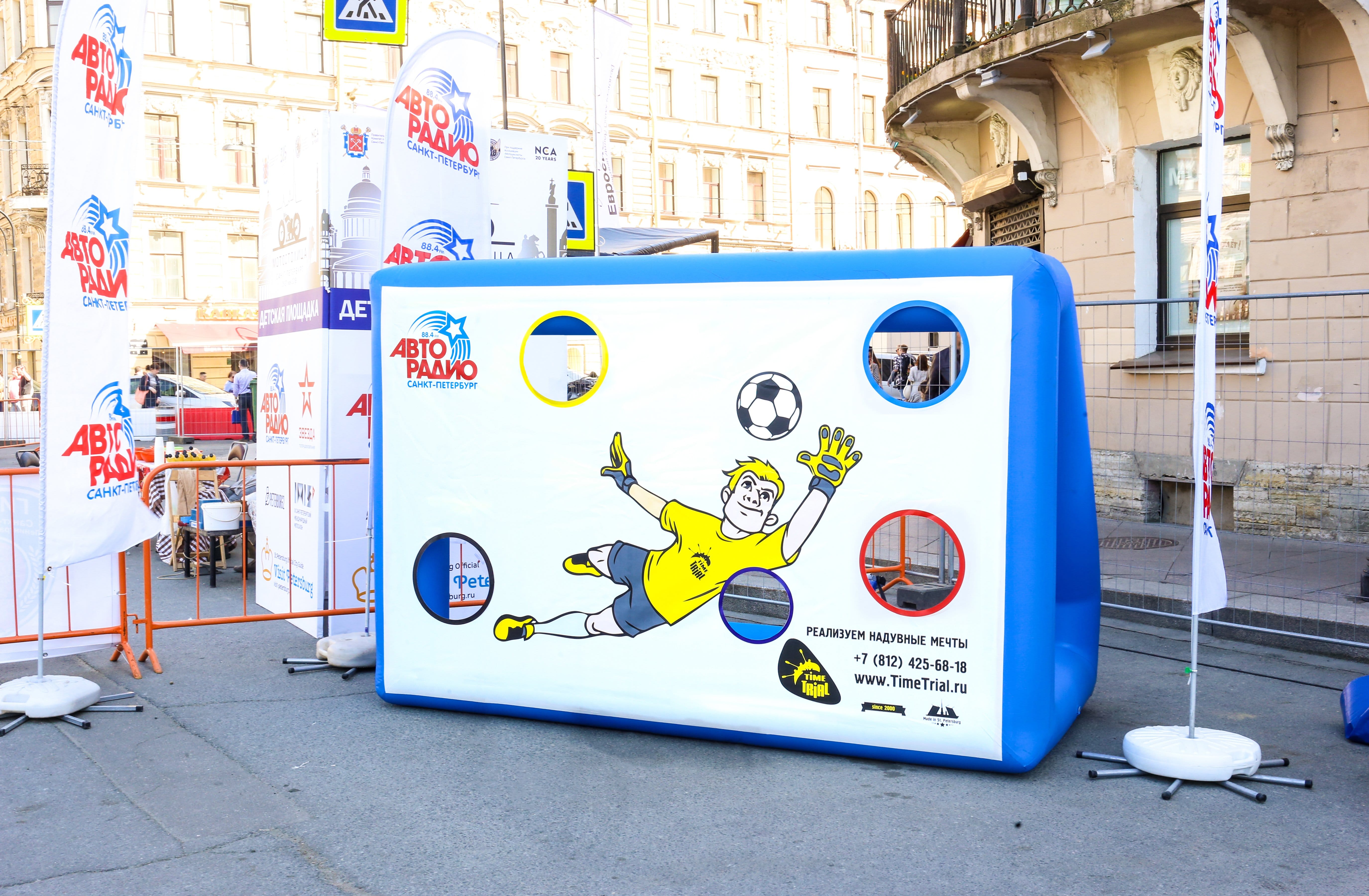Надувной Аттракцион точный гол представляет собой надувные ворота, в которых есть несколько отверстий. Цель игрока — попасть футбольным мячом в одно из них. Для придания соревновательного духа игре, на воротах может стоять голкипер.
