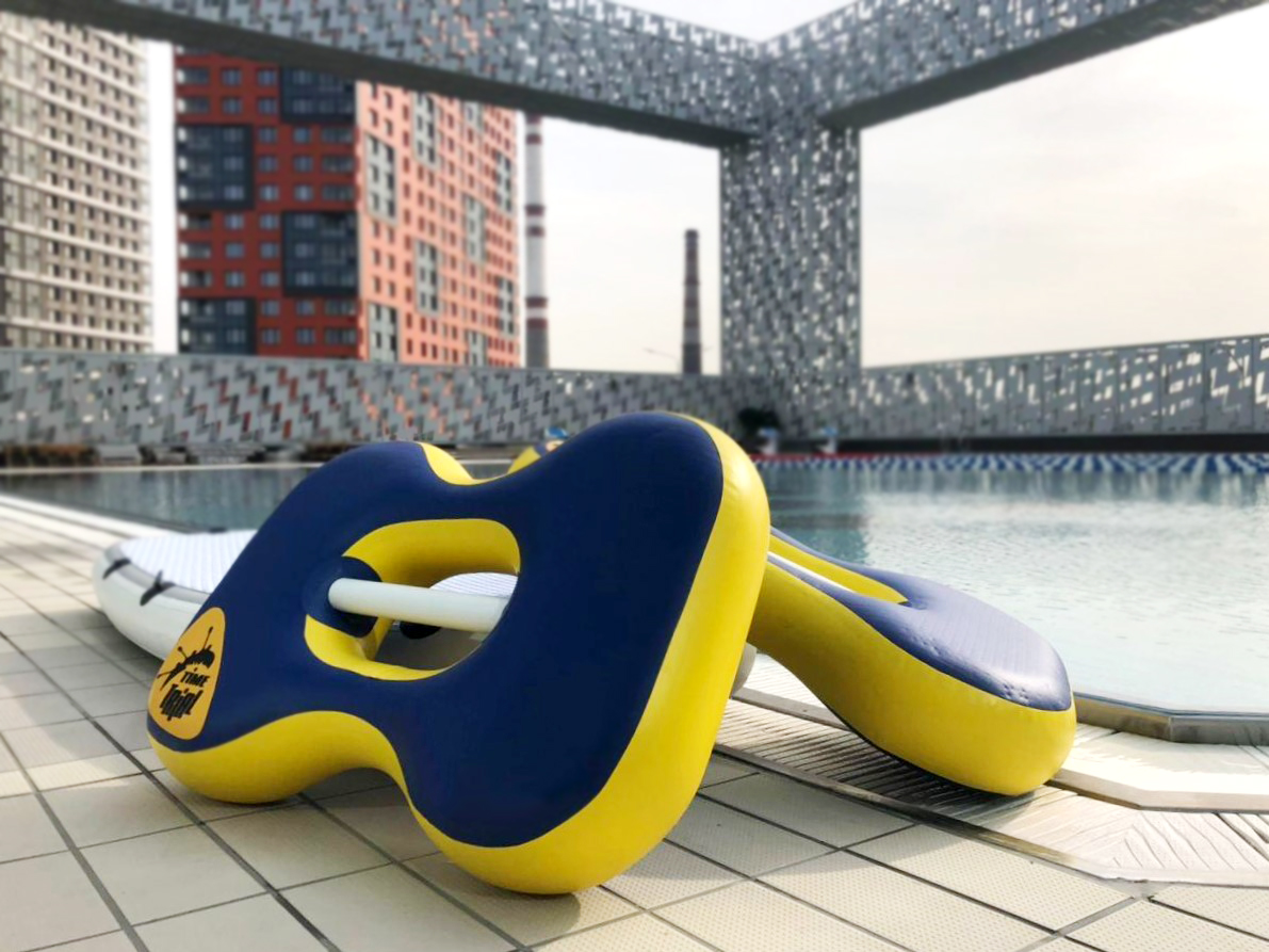Занятия на данной модели тренажера имитируют отжимания на параллельных брусьях. Компактное надувное спортивное оборудование помещается на малой площади, что позволяет рационально использовать пространство: в бассейне можно тренироваться группами.