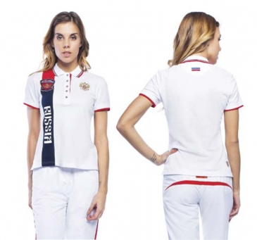 Поло из трикотажного полотна «пике». Застежка на пуговицы. На правой части полочки вертикальная полоса контрастного цвета. По боковым швам разрезы.
