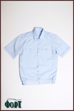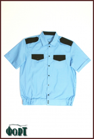 Рубашка выполнена из сорочечной ткани голубого цвета. Модель укороченная на поясе с резинкой. Застежка на пуговицах. Погоны, клапаны нагрудных карманов и отделка воротника выполнены из сорочечной ткани черного цвета. Воротник отложной. Так же имеется вариант с длинным рукавом.