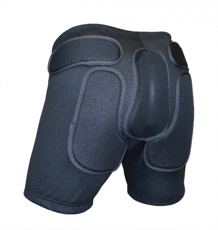 Защитные шорты без боковых накладок, комбинированная с пластиком накладка на копчике, верхние накладки сдвинуты на спину.