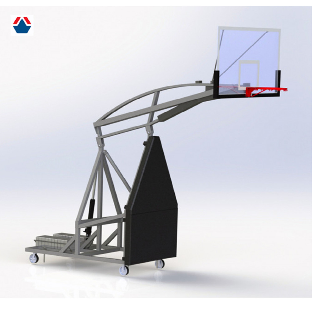 Стойка баскетбольная мобильная складывается таким образом, что баскетбольный щит компактно расположенный в горизонтальной плоскости основания конструкции, в сложенном положении не имеет острых углов и других элементов, выступающих за пределы конструкции, которые могут травмировать спортсменов, занимающихся в спортивном зале. Значительно экономит пространство и время, и может быть размещена на время хранения под трибунами спортивного зала.