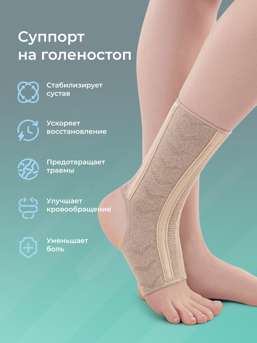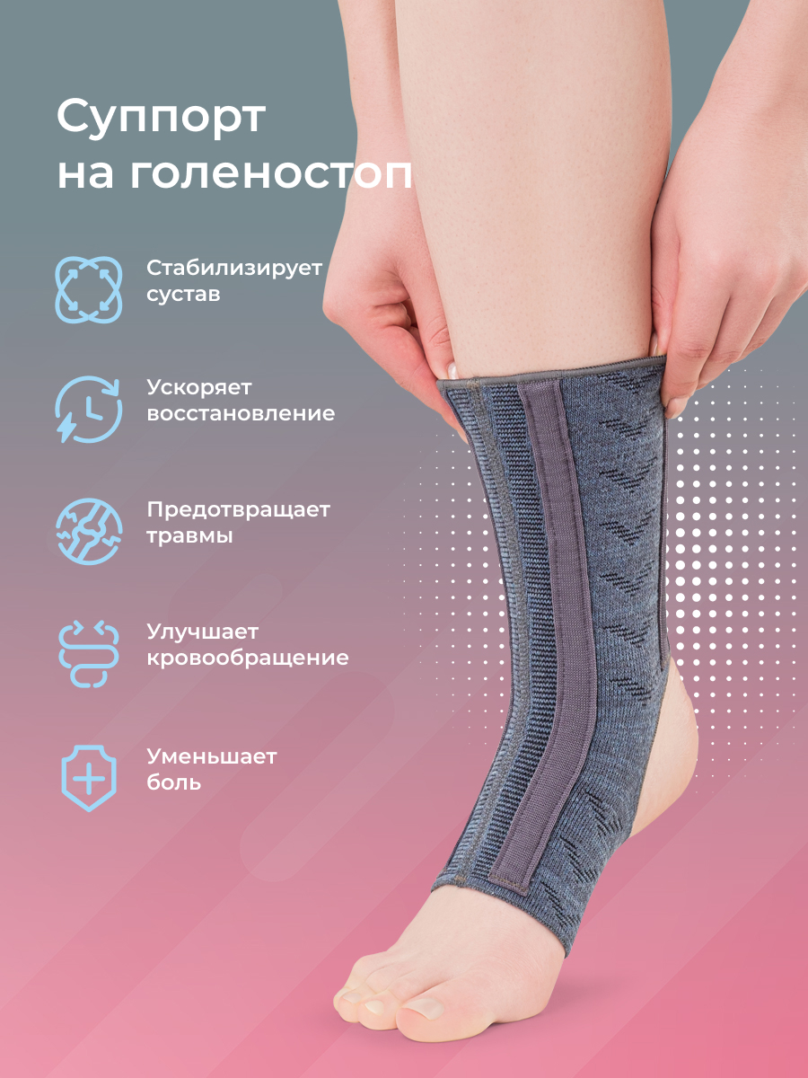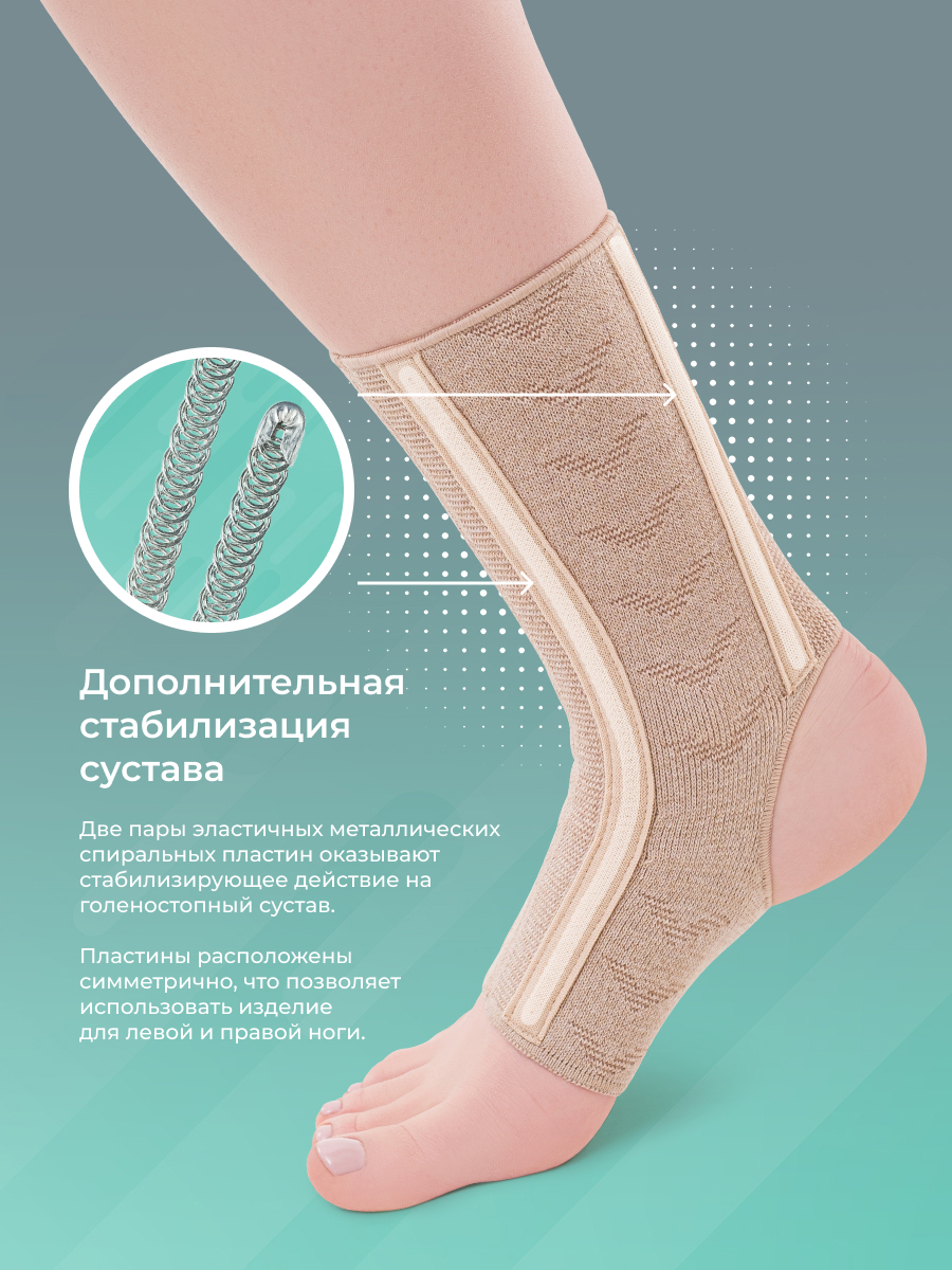 Суппорт на голеностоп представляет собой эластичное компрессионное изделие с умеренной степенью фиксации. Суппорт имеет две пары эластичных металлических спиральных пластин, которые оказывают выраженное стабилизирующее действие на капсульно-связочный аппарат голеностопного сустава. Спиральные пластины расположены симметрично, что позволяет использовать изделие для левой и правой ноги.  Суппорт обладает выраженными тактильными и антибактериальными свойствами.