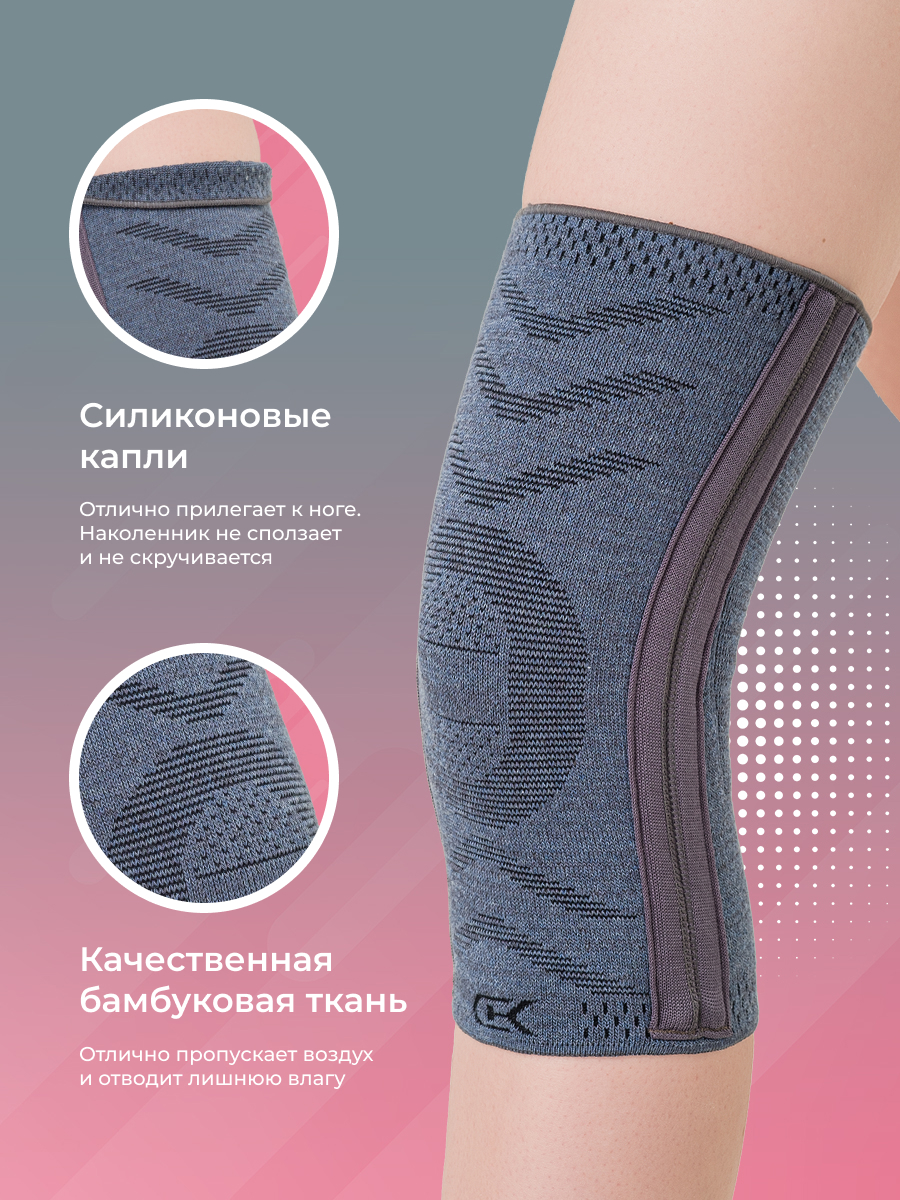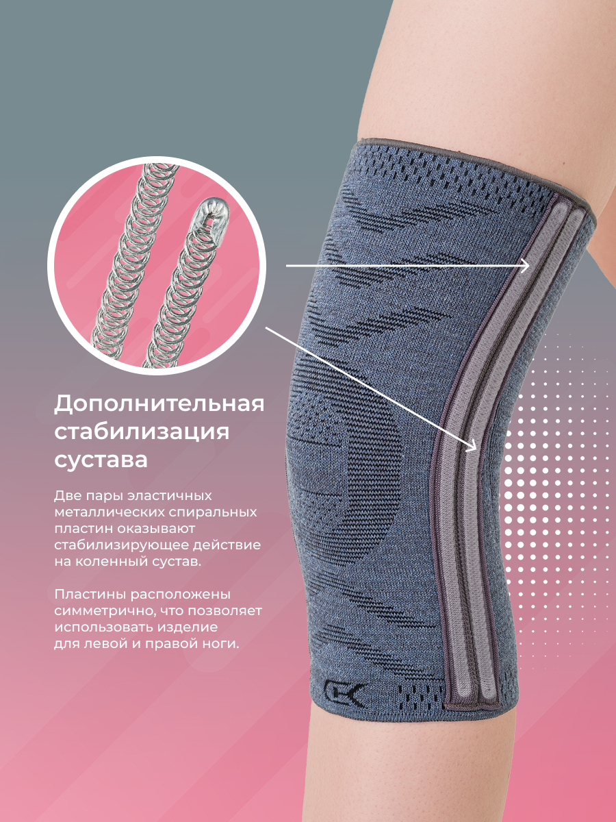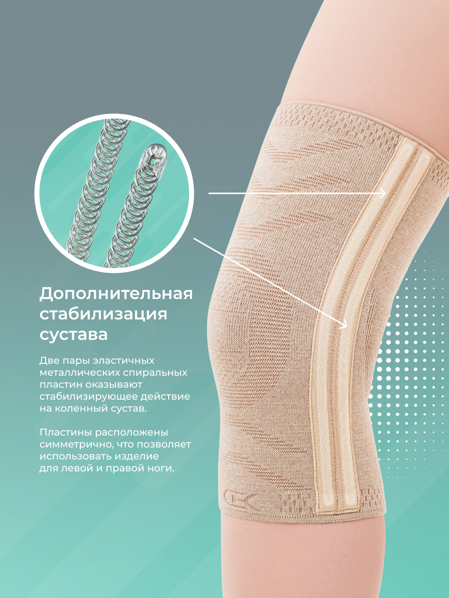 Суппорт на колено представляет собой эластичное компрессионное изделие с умеренной степенью фиксации. Суппорт имеет две пары эластичных металлических спиральных пластин, которые оказывают выраженное стабилизирующее действие на капсульно-связочный аппарат коленного сустава. Спиральные пластины расположены симметрично, что позволяет использовать изделие для левой и правой ноги.  Суппорт обладает выраженными тактильными и антибактериальными свойствами.