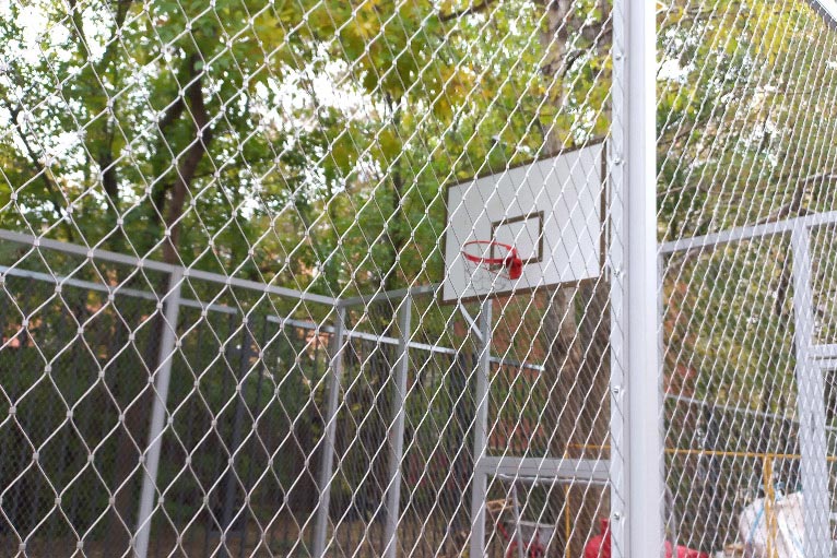 Сетка из нержавеющего троса 7х7 диаметром 3 мм с ромбической ячейкой диагонали которой составляют 80 и 140 мм соответственно, а длина стороны составляет 80мм.