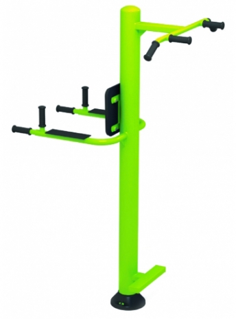 Пользователь, держась руками за рукоятки, подтягивается. Второй пользователь, держась руками за рукоятки и упираясь спиной в спинку, выполняет упражнения для пресса.