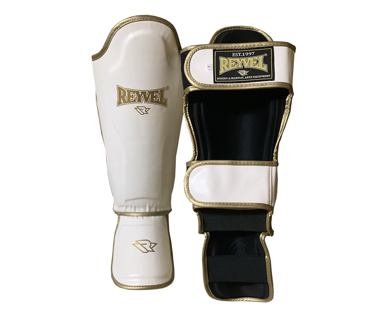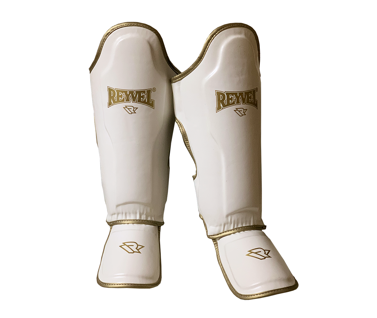 Внешний материал – ударопрочный винил, подкладка выполнена из прочной быстросохнущей ткани. Крепится на ноге двумя широкими застежками на липучке, расположение застежек обеспечивает плотное прилегание и исключает проворачивание во время тренировки, стопа и пятка фиксируются прочными резинками. Защиту голени и стопы обеспечивает трехслойный вкладыш из полимерной пены