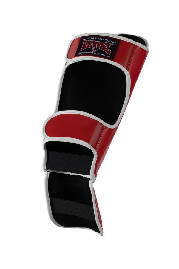Внешний материал – ударопрочный винил, подкладка выполнена из прочной быстросохнущей ткани. Крепится на ноге двумя широкими застежками на липучке, расположение застежек обеспечивает плотное прилегание и исключает проворачивание во время тренировки, стопа и пятка фиксируются прочными резинками. Защиту голени и стопы обеспечивает трехслойный вкладыш из полимерной пены